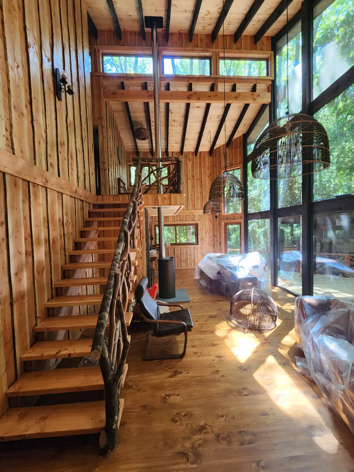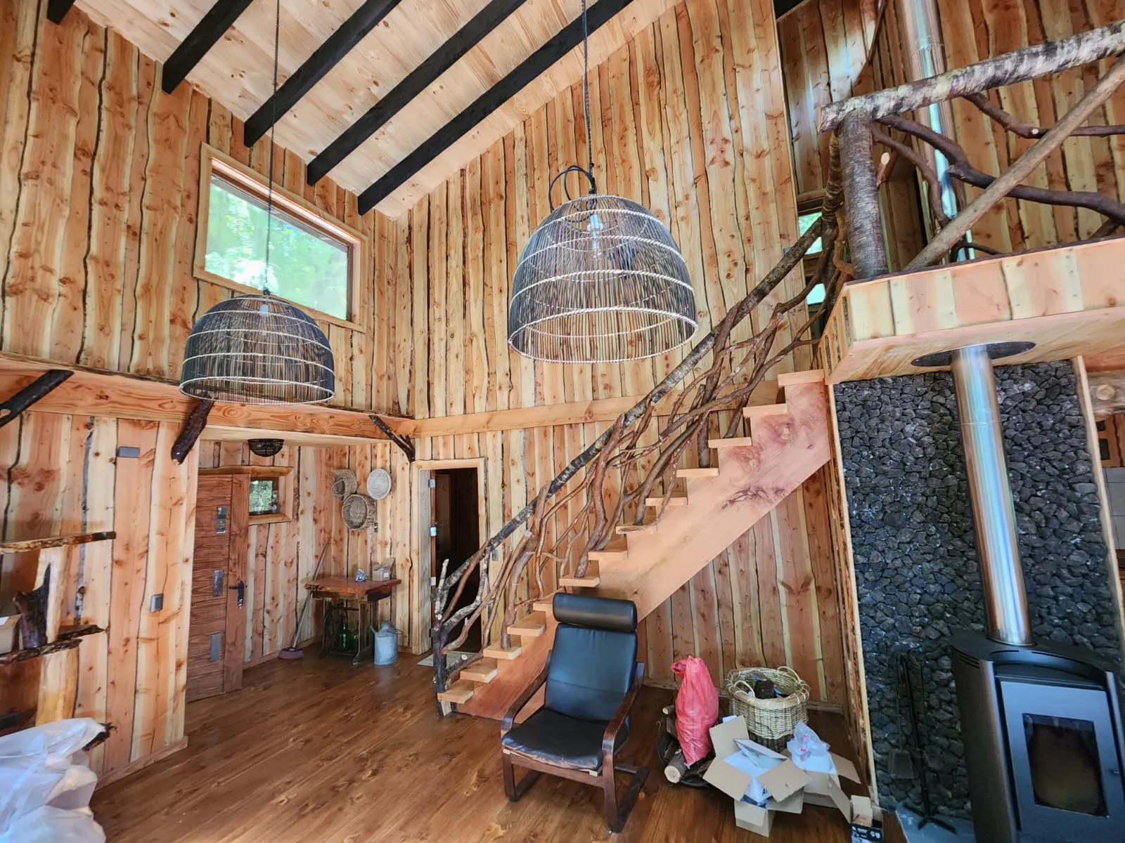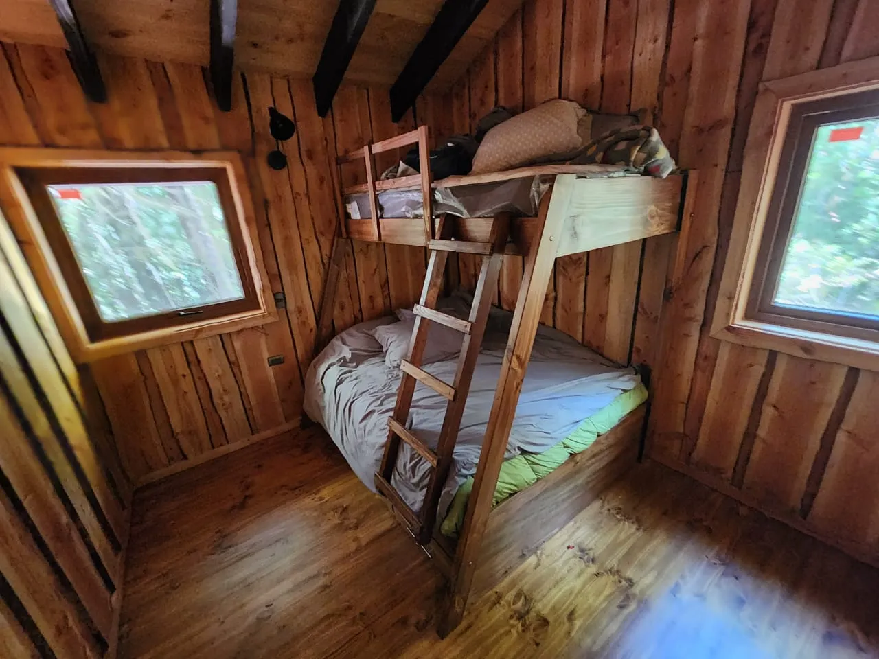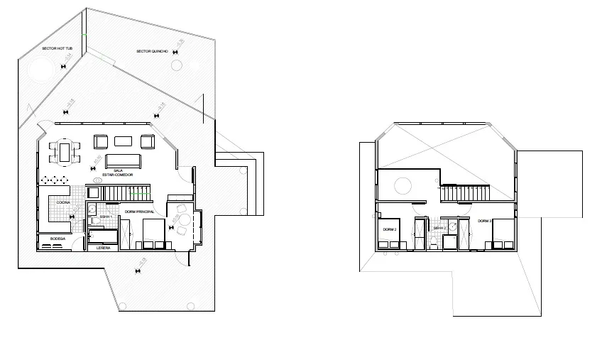 El segundo piso se articula a través de una escalera que adopta un rol protagónico, tanto a nivel visual como arquitectónico, transformándose en un elemento central dentro de la vivienda. Desde este punto se accede a dos dormitorios, un baño y una sala de estar, conformando un ámbito más íntimo y familiar, siempre conectado visualmente con el espacio principal y con las vistas hacia el entorno natural.