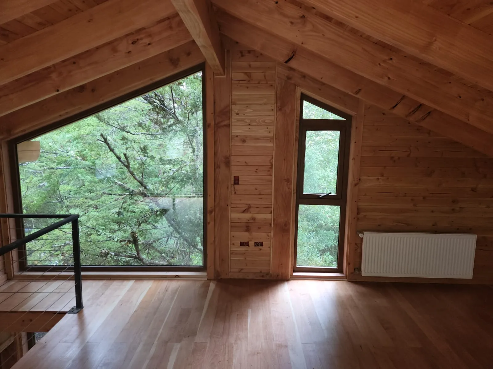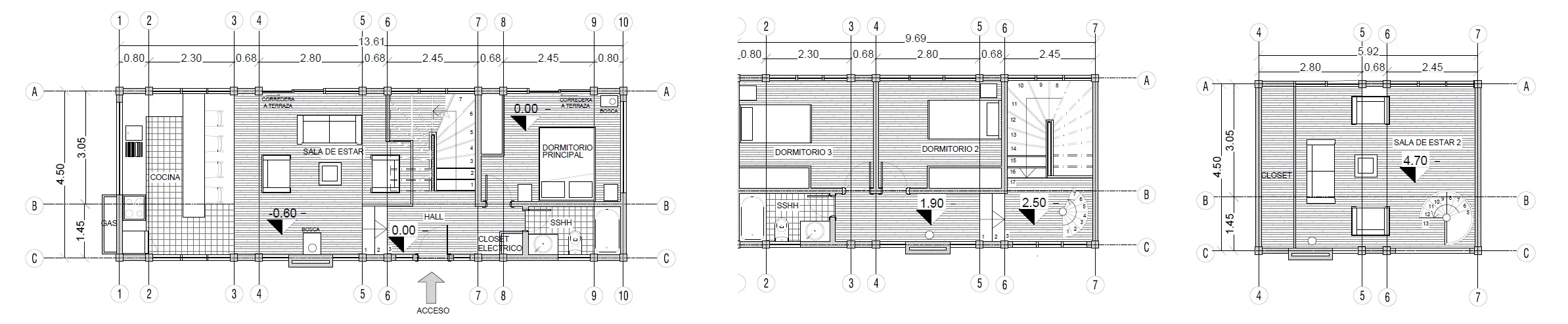 El segundo piso alberga dos dormitorios y un baño, configurando un área más íntima y familiar. Finalmente, en el tercer nivel, la mansarda se proyecta como una sala de estar con vistas panorámicas, convirtiéndose en un espacio privilegiado de contemplación y uso flexible, estrechamente vinculado al paisaje.